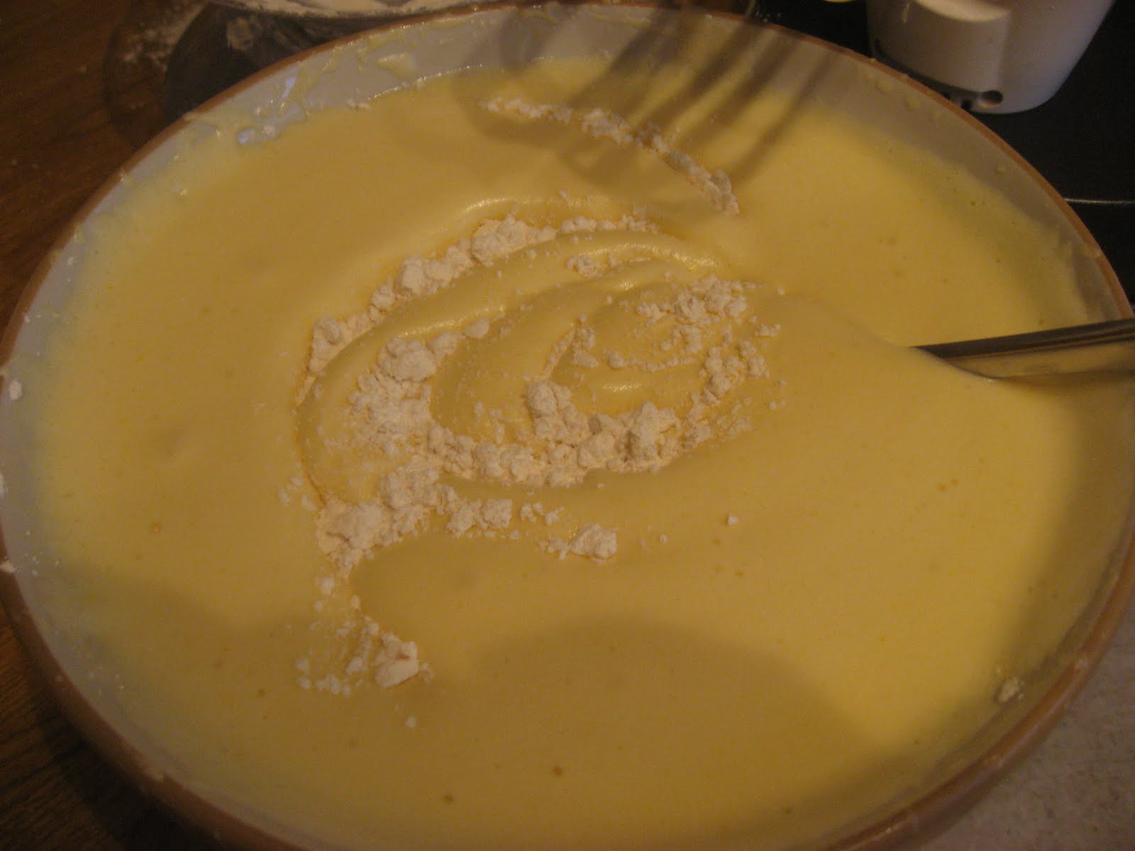 3. You little star! That’s your workout done for the week. Now it’s time to combine all your different flours and your custard powder, and sift them together THREE TIMES! Yes! Three please. It’s like something out of a fairy tale, isn’t it! Three wishes. So sift three times….then use a slotted metal spoon and fold the flour mixture into the egg mixture until just combined.