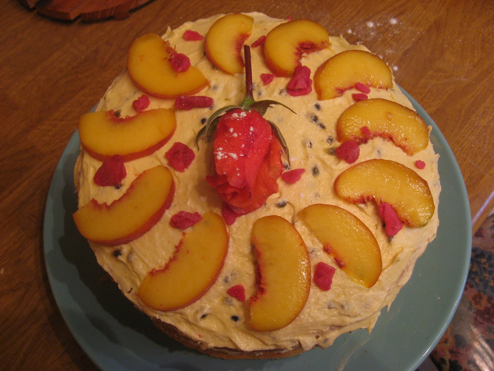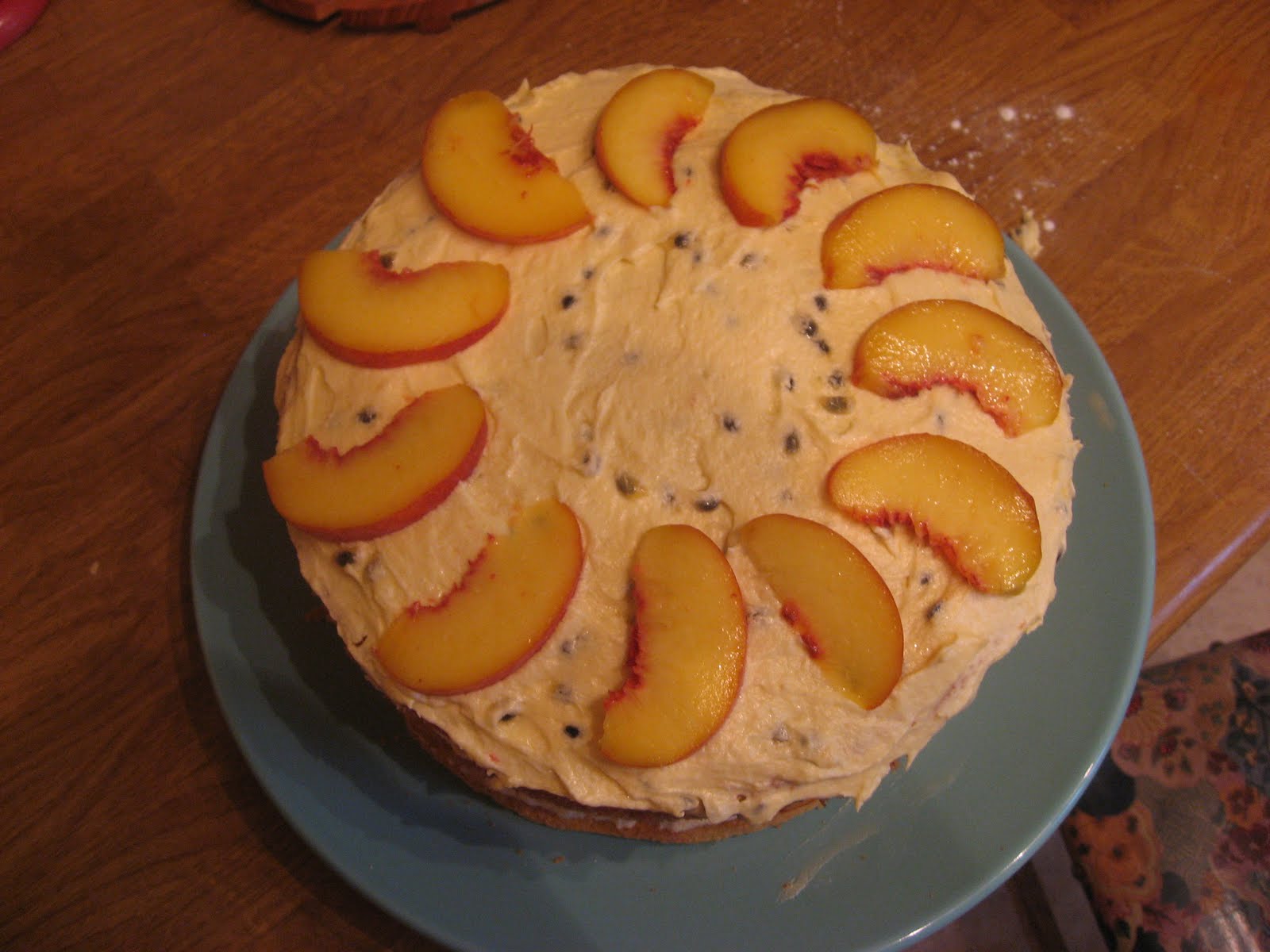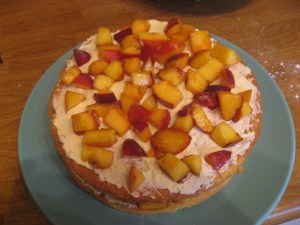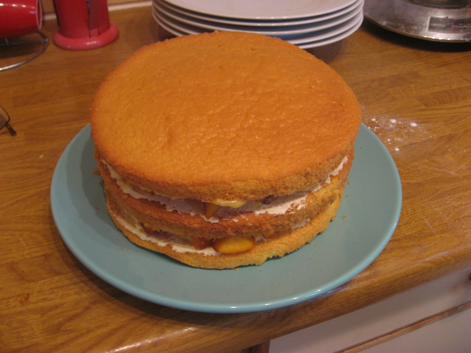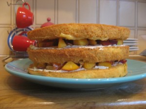 2. Then pop your first sponge on a plate (we’ll start you off easy). Spread with cream then put your peaches/fruit of choice on top of the cream.