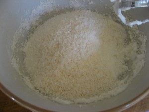 5. Add the castor sugar a third at a time, and beat for 2 minutes between each addition. It may sound labour intensive, but you really won’t regret it – when you’re using something like desiccated coconut, the rest of the cake needs to be EXTREMELY SMOOTH. As smooth as…no, no, I do that joke every blog entry. After the last addition of sugar, keep beating until you can hardly feel your wrist. You want it to look as though the sugar has almost completely dissolved into the mixture.