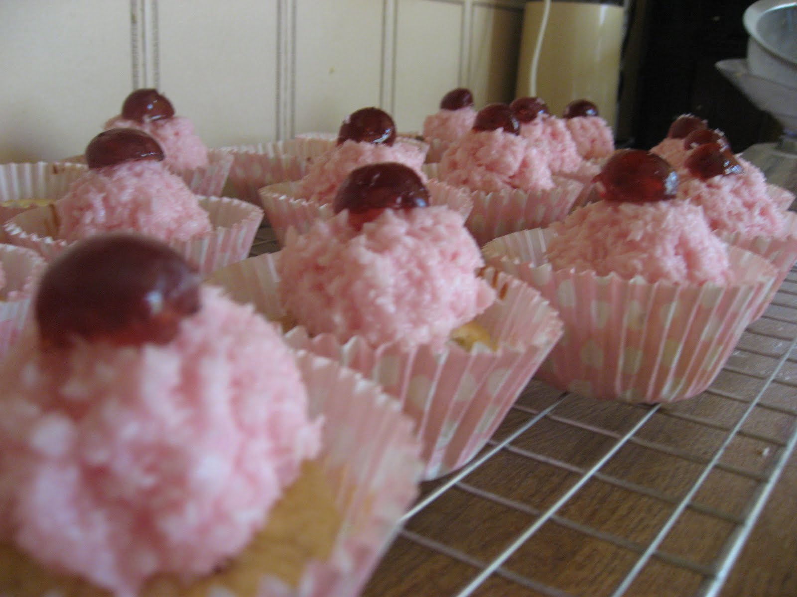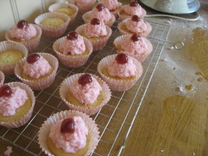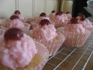 5. Sorry, might have got a tad carried away. Now, I’m afraid there are no pictures of the following steps, because of Speed 4 syndrome – I couldn’t possibly pause to photograph. Take my word for it. Here’s what you do: Use your hands to roll a large spoonful of icing into a ball, around the size of a tiny peach. Place it (QUICKLY) on top of your cake, and shape it. Sprinkle with more desiccated coconut and top with half a cherry.
