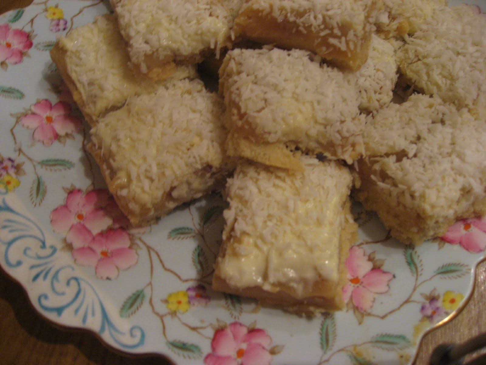 3. While the chocolate’s still molten (brilliant word), sprinkle over the desiccated coconut and leave to cool, before cutting into squares.