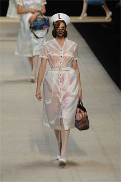 Because, dear reader, I was convinced I’d picked up some kind of Frankensteined Vogue, composed of old editions. I was sure it wasn’t new. It was the Gucci ad first; models with blackened eyes, draped in cigarette pants and Midas touched-black – a classic look for the design house. I flicked the page. Louis Vuitton now, a spread of see-through bags clutched by pristine, fifties-esque models. But this was triggering a memory too – yes, the infamous Louis Vuitton ‘nurses’ in sheer coats, gliding sinisterly down the catwalks, back in 2008.