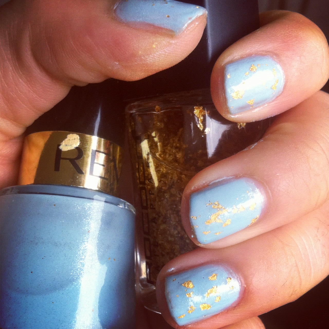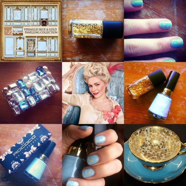 Probably my favourite colour combination is blue and gold. If you haven’t picked up on my Marie Antoinette/Versailles obsession yet, I’ll just reiterate it for you once again. I think it’s such a beautiful combination, and I liked the idea of recreating this on my nails. It makes me think of pale Spring skies and shards of sunlight, or the way the Autumn sun shines through leaves, illuminating them. I purchased the Rococo gold leaf lacquer from Space NK in Tunbridge Wells a couple of years ago, and despite an initial phase of wearing it frequently, I’ve kind of left it alone. It’s got formaldehyde in, which smells quite a bit and makes me feel like Damien Hirst. But today I needed serious perking up, and so out it came. I hope you like the results. What’s your favourite nail varnish/colour combination?