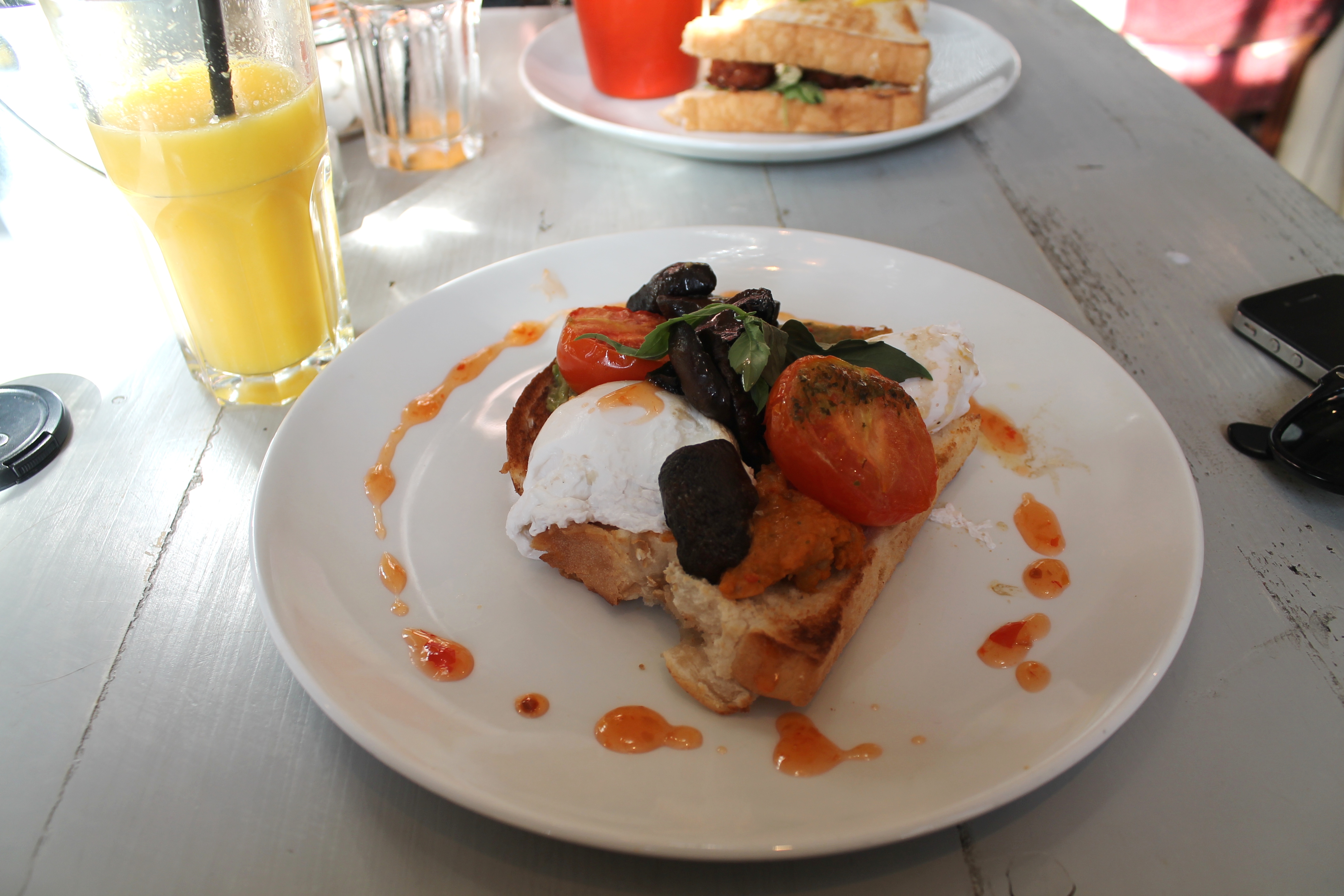 Since discovering Bill’s in Lewes, I’ve been a massive fan of the place. Always a buzzy, cosy atmosphere, with walls stacked full of preserves and jams and absolutely delightful staff. As for the food….wow. It’s all big, bold, bright and healthy (apart from the glorious puddings, but who wants a healthy pudding?!) I opted for the vegetarian breakfast – two door wedges of rustic bread, one with guacamole, one with a kind of chunky hummus and spicy tomato sauce, two perfect poached eggs, sauteed mushrooms and roasted tomatoes, with a serving of sweet chili sauce for good measure. HEAVEN ON A PLATE.