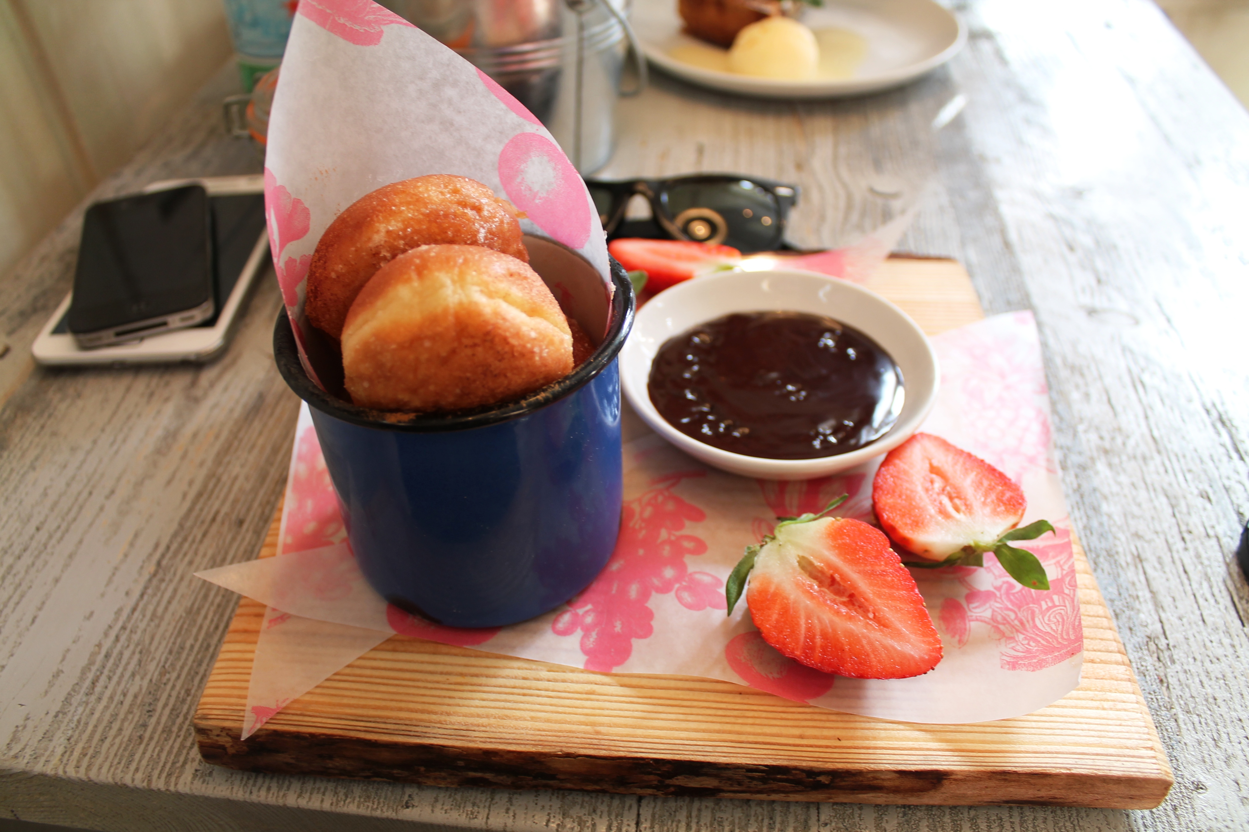 India went for the fish finger sandwich, which I expected to be two sad squares of white bread filled with formerly frozen fingers. Not so – stacked home made bread, home made fish fingers, a little pot of skinny fries…Please, please, I implore you to try Bill’s. It reminds me of restaurants that Cornwall does so well but we don’t seem to really manage in the South East. India and I introduced a new custom which I think should catch on: brunch with pudding. She had a gooey, rich pecan pie with vanilla ice cream, I went for plump, warm mini cinnamon donuts with chocolate dipping sauce and fresh strawberries.