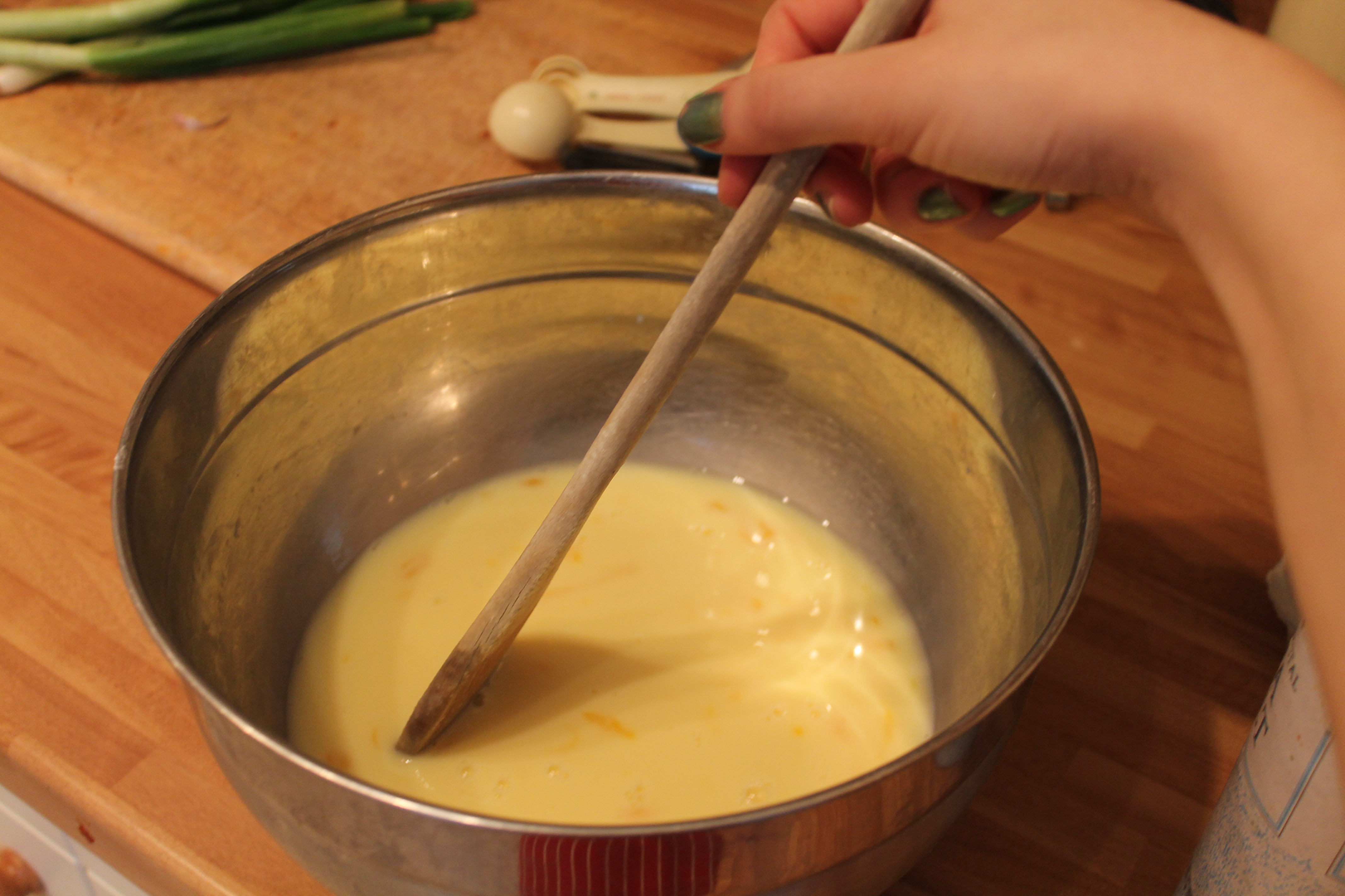 2. Mix milk, eggs, butter, sweetcorn and spring onions in a large bowl