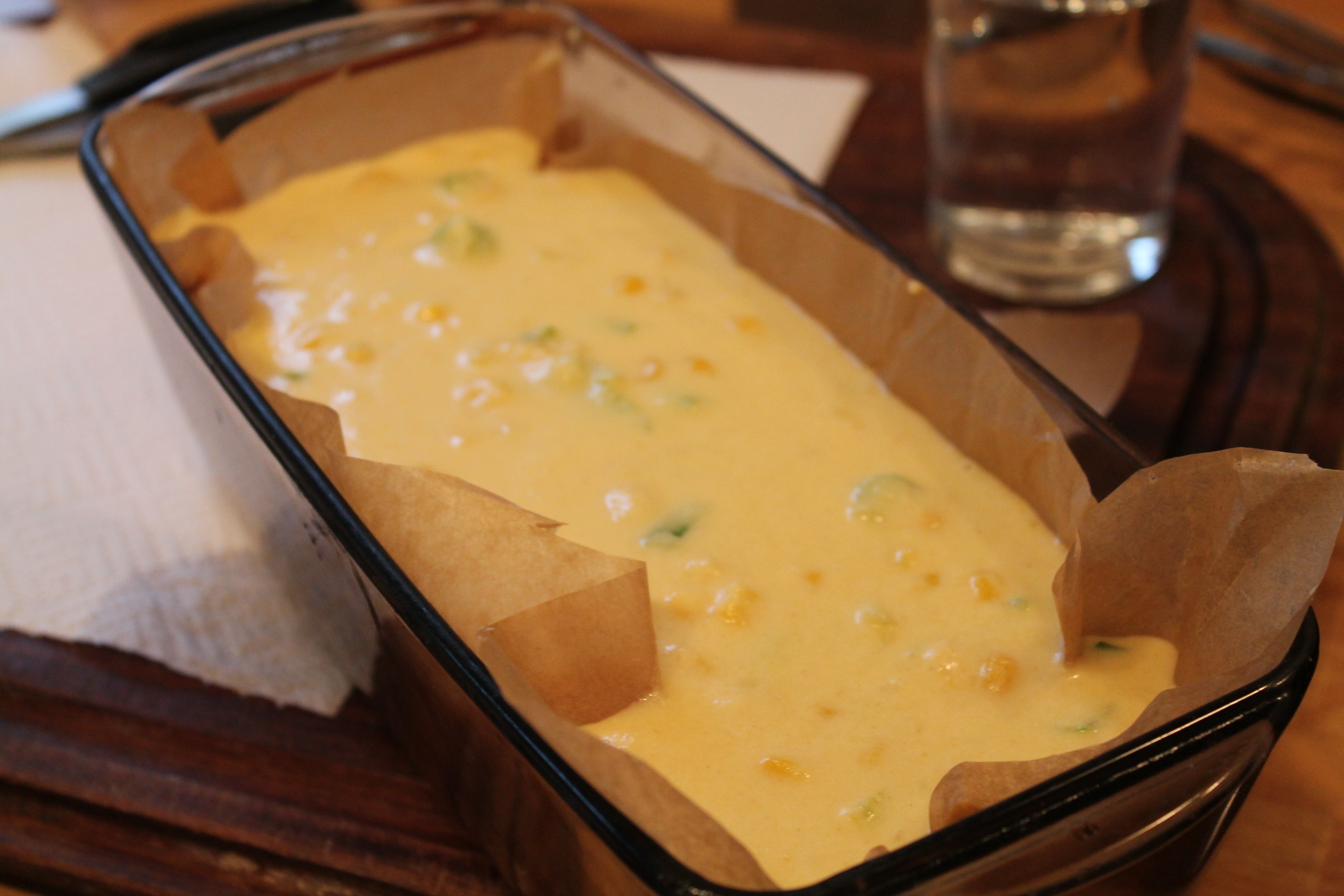 1. Preheat oven to 200 degrees C if you haven’t already done so for the bacon & line a 900g loaf tin with baking parchment