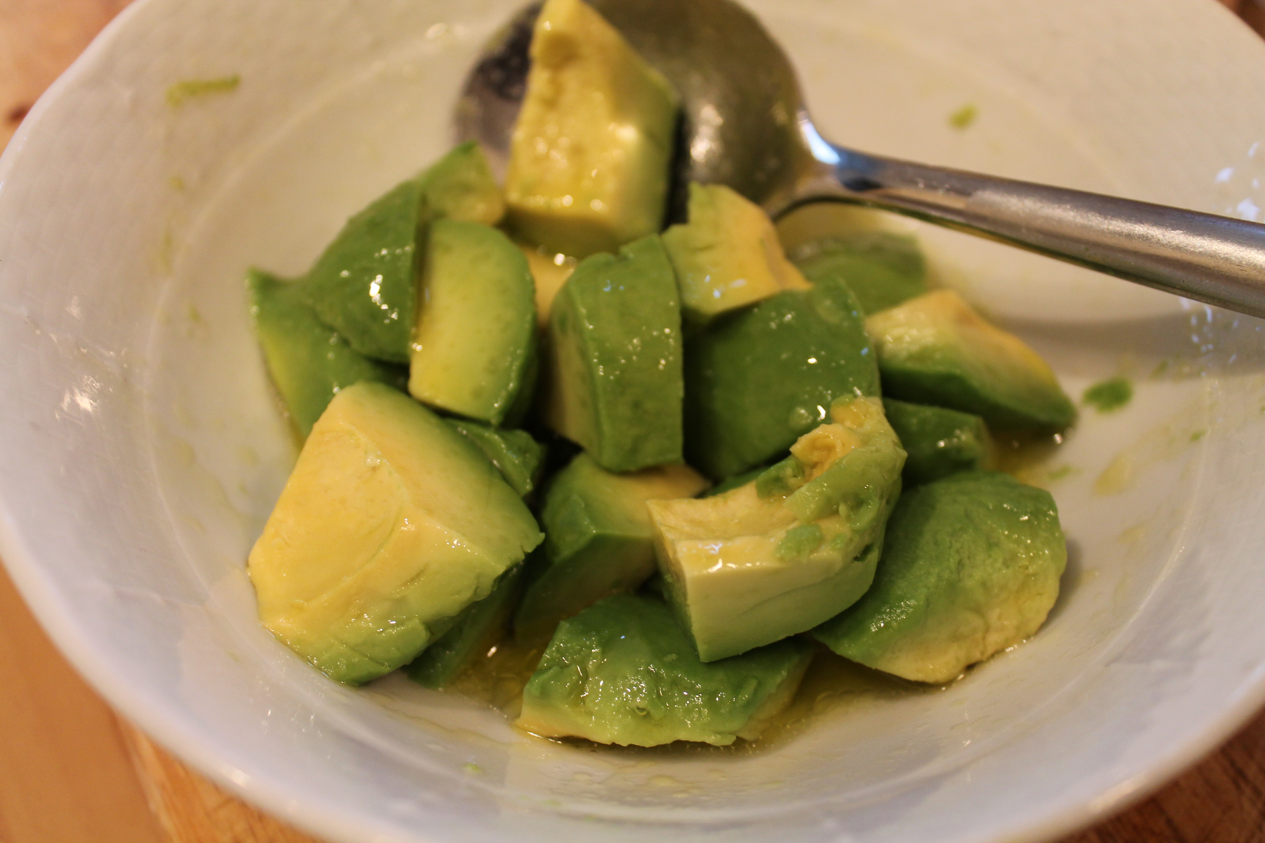 1. Combine lemon juice and olive oil in a bowl, then add avocado and leave it to combine for a few minutes