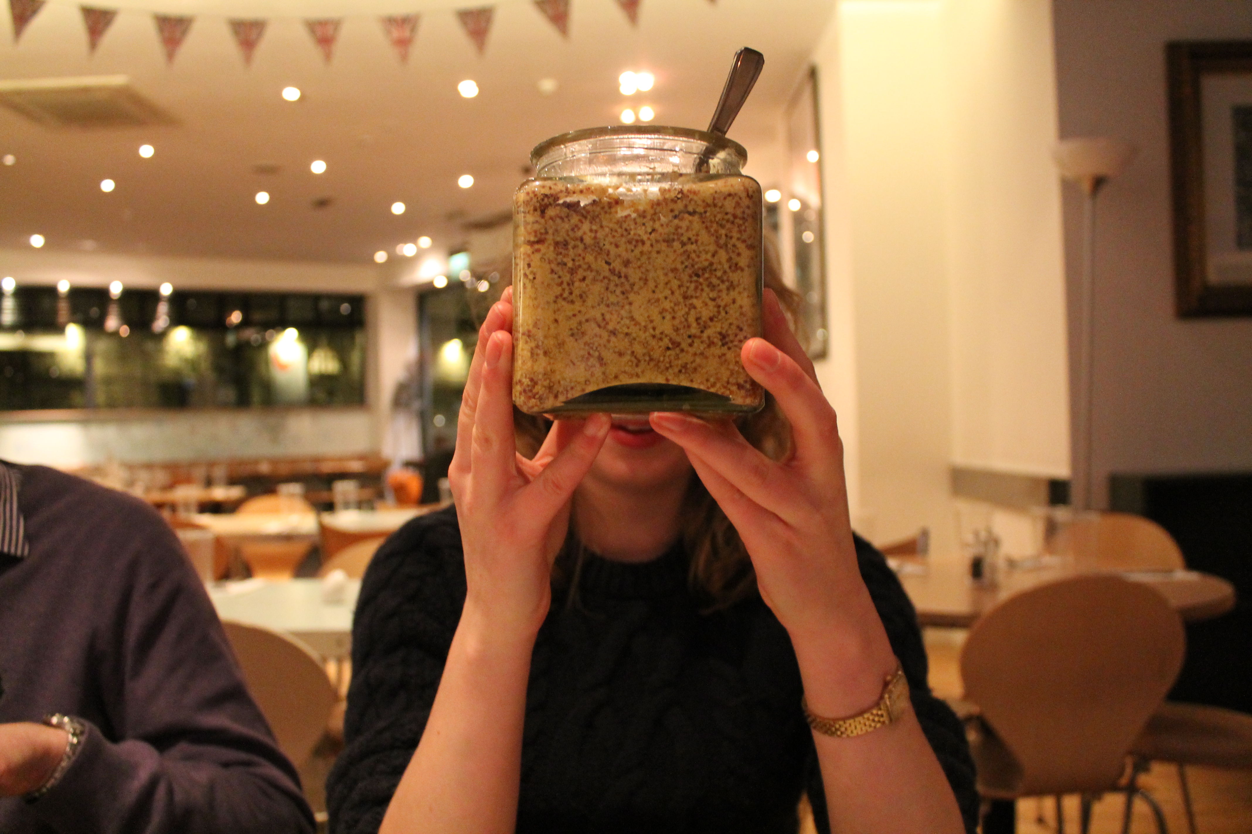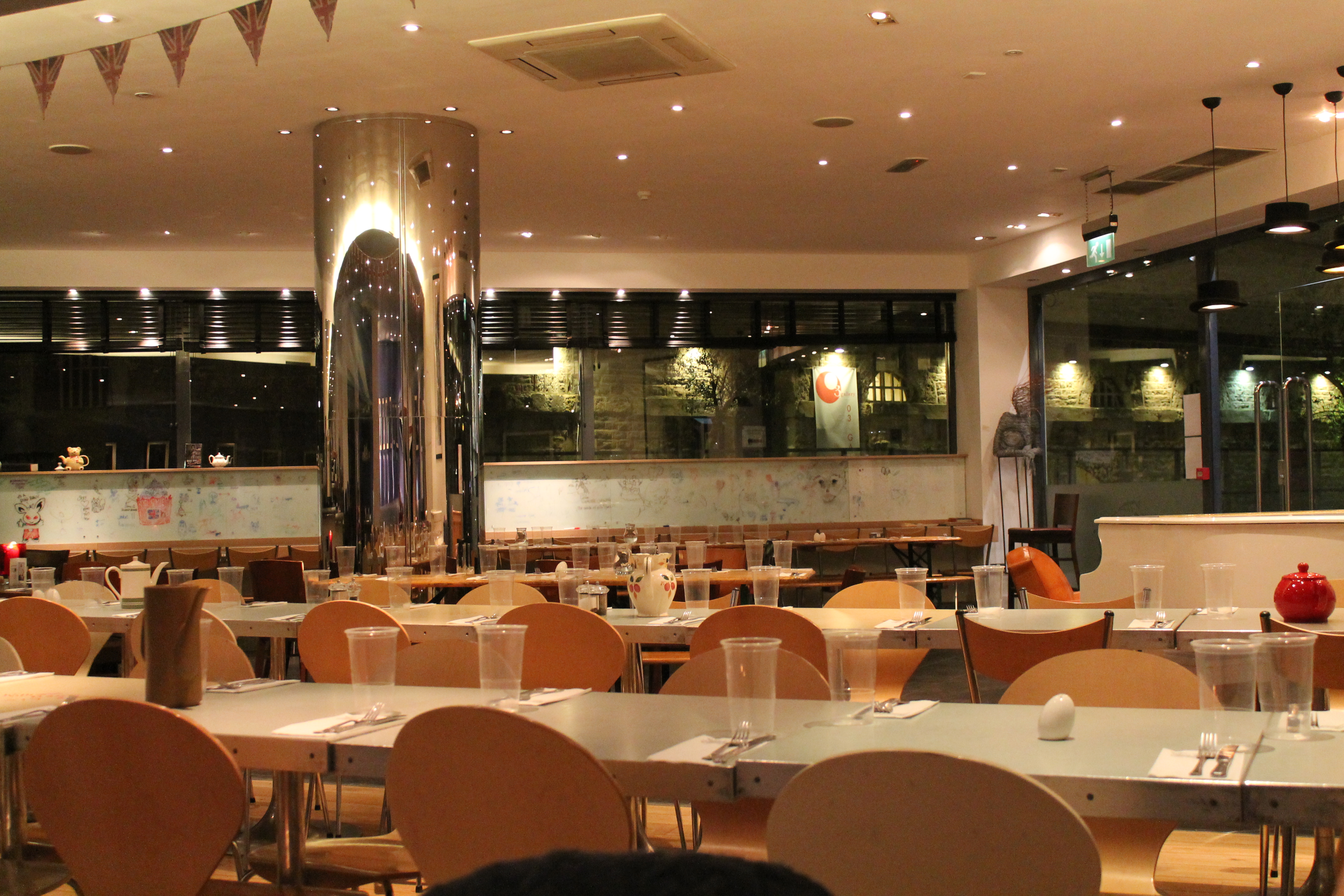 I arrived at 2pm to find a slate-skied Oxford, chilly and snowy. I’d intended to have a wander and find some new places, but it was just too cold. After some determined trudging, I decided to cut my losses and parked myself in Turl Street Kitchen for most of the afternoon. A cup of black vanilla tea and a sublime vanilla cupcake later, I was feeling much more human – the James Brown on the Turl Street playlist helped too. Around 5, I met my friend Lucy and headed to The Big Bang in the Castle Quarter for ginormous plates of bangers and mash, water in teapots and a very deadpan waiter. I mentioned before I was into British food at the moment, and I’d strongly recommend this place for any veggies looking for a decent savoury meal. For once, I felt like just as much thought had gone into the veggie options than on the meat, and I opted for one stilton & walnut and one vine tomato & basil sausage on grain mustard mash with red wine gravy. I followed it with an apple crumble, which was a bit on the ‘smooshy’ side and needed a little crisping up. But for the savoury part, it couldn’t be faulted.
