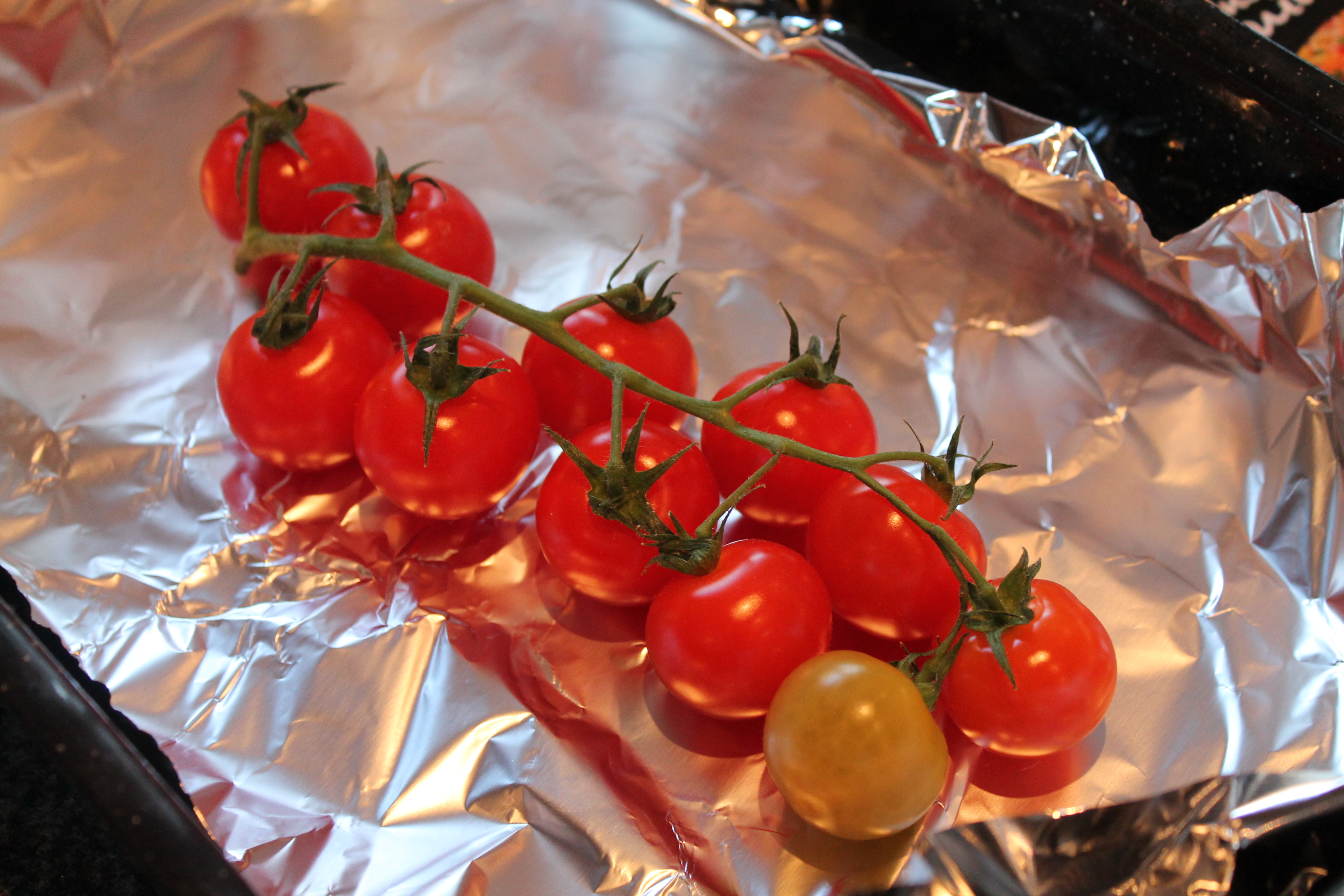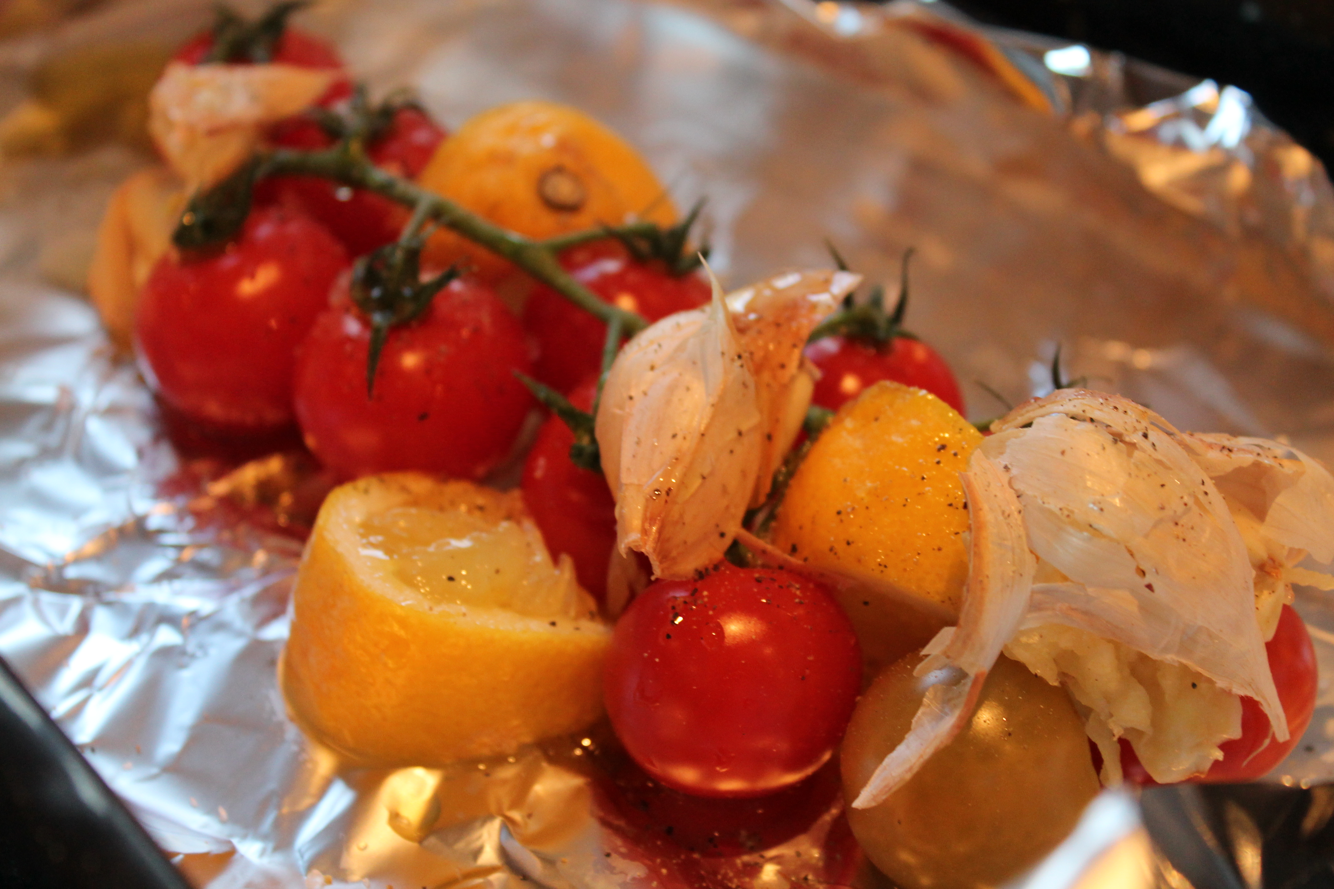 1. Heat oven to 180°C. Keeping your tomatoes on the vine, place them in foil or a roasting dish. Drizzle with olive oil and sprinkle with salt and pepper. Smash garlic cloves with the handle of a knife and wedge in with the tomatoes, along with the three thick lemon slices. Roast for 30-40 minutes, until the skins start to split (sounds pretty gross, right?)