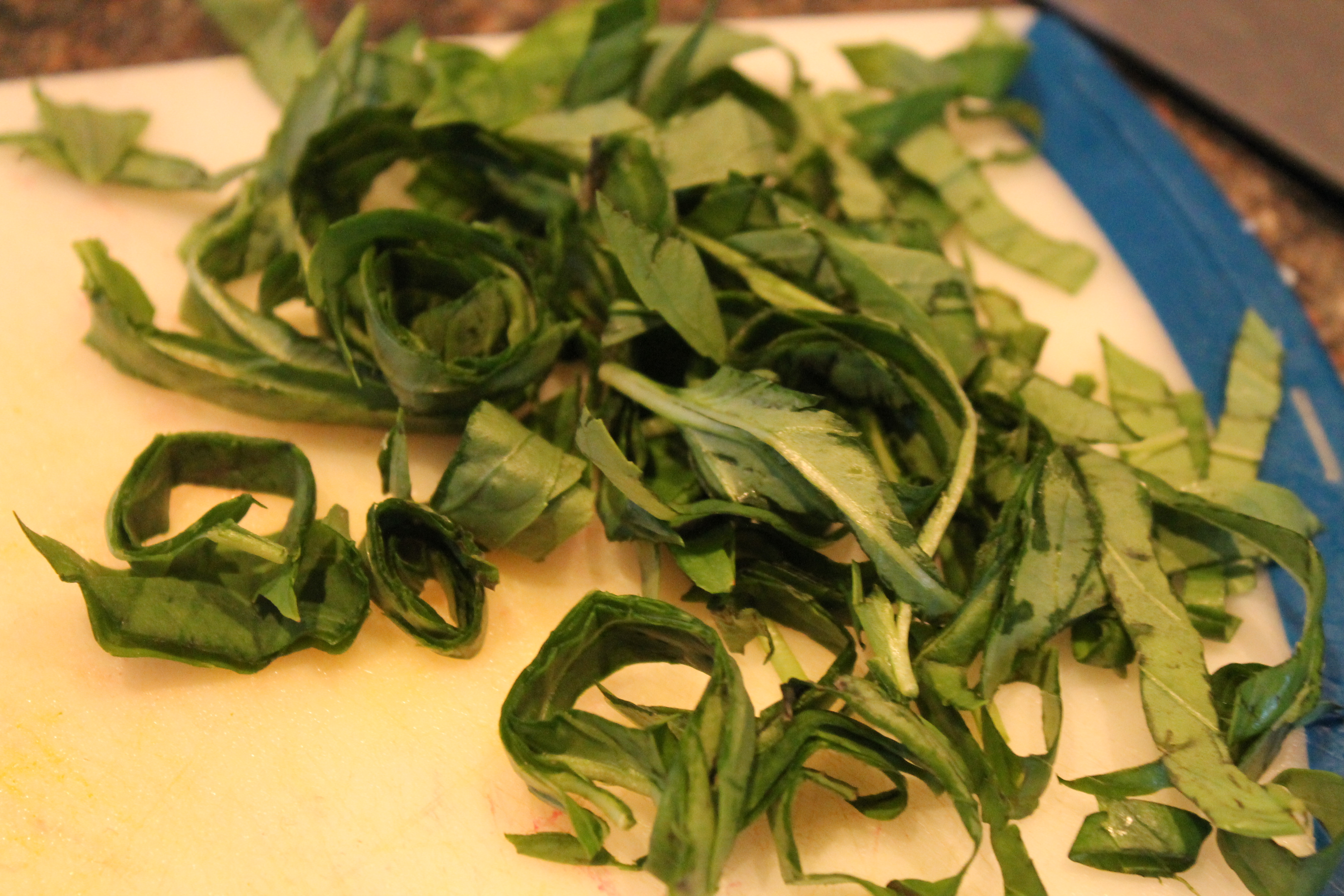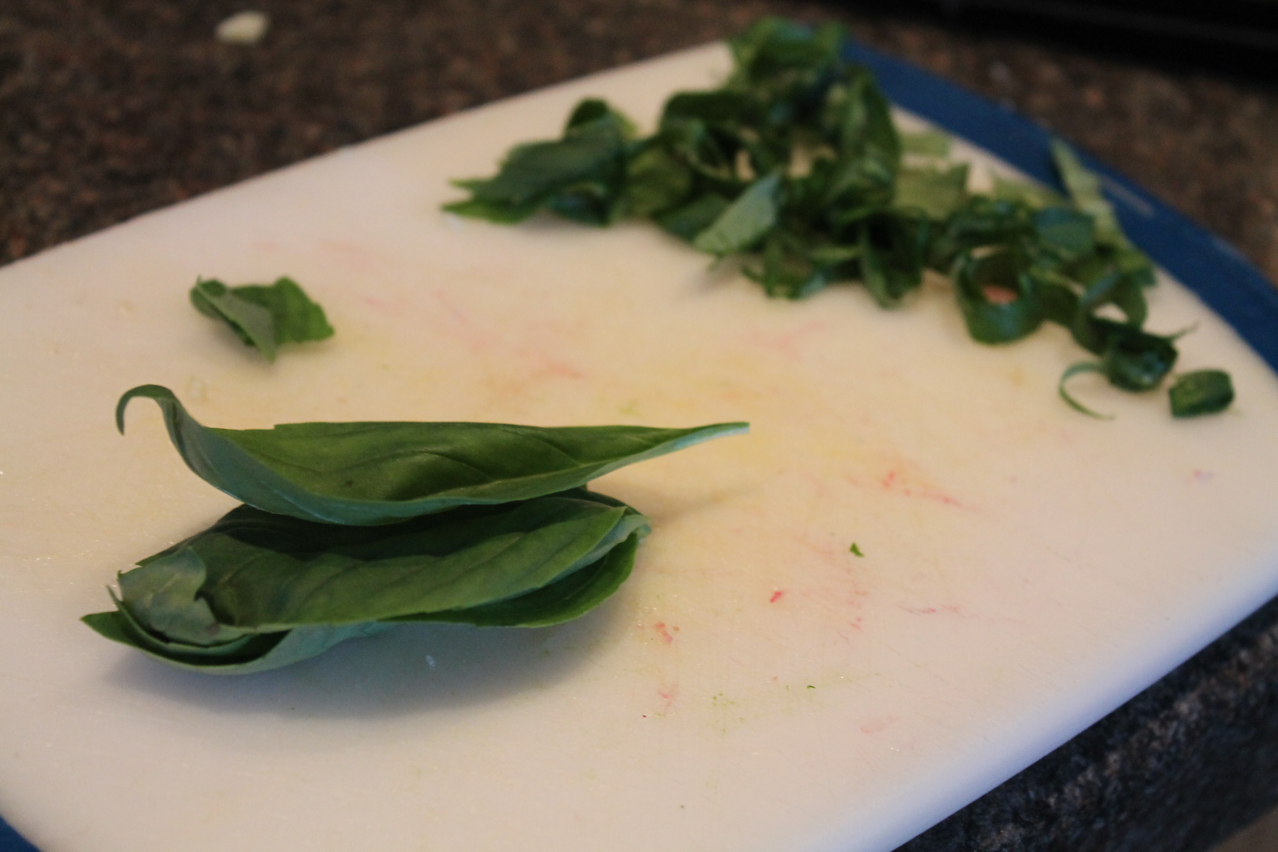 3. Cook the spaghetti according to packet instructions – feels like a real cop out writing that in my recipe, but hey ho. Wash spinach or rocket and leave to drain. Stack basil leaves on top of each other and roll up so it looks like you’re going to be up to no good with it, then slice – this will give you ribbons of basil and is called ‘Chiffonade’. Pretty cool, eh?
