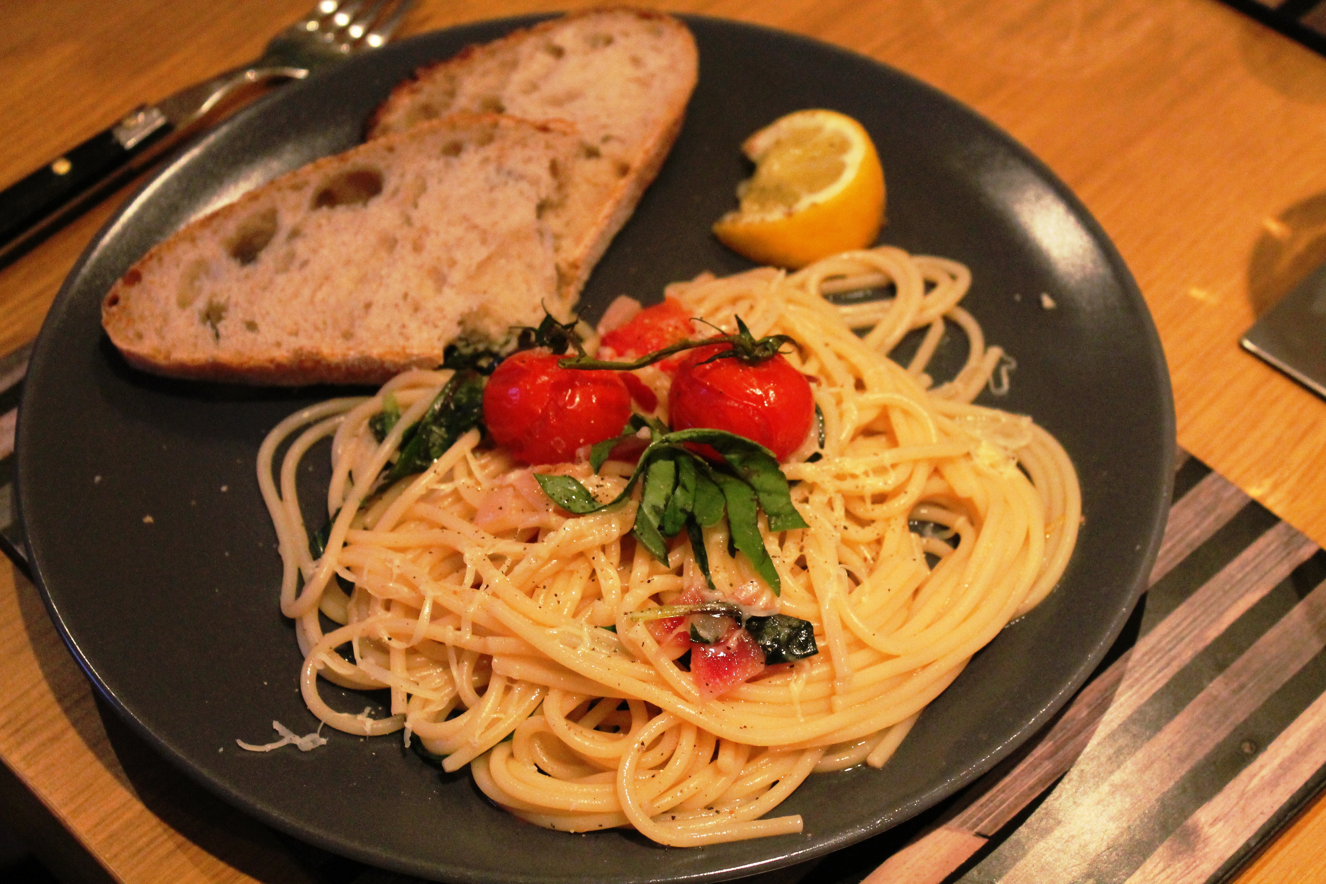 4. To assemble, drain spaghetti and add it to the pan containing the sauce. Slice off half of the tomatoes and stir them in, preserving the rest on the vine. Add leaves, basil, and finely grate a cheese of your choice and stir it all in, leaving the flavours to marry together on the stove for about 10 minutes. Top with two tomatoes still on the vine on each dish, some more grated cheese, a lemon wedge, and a thick slice of sourdough or crusty bread to mop up flavours.