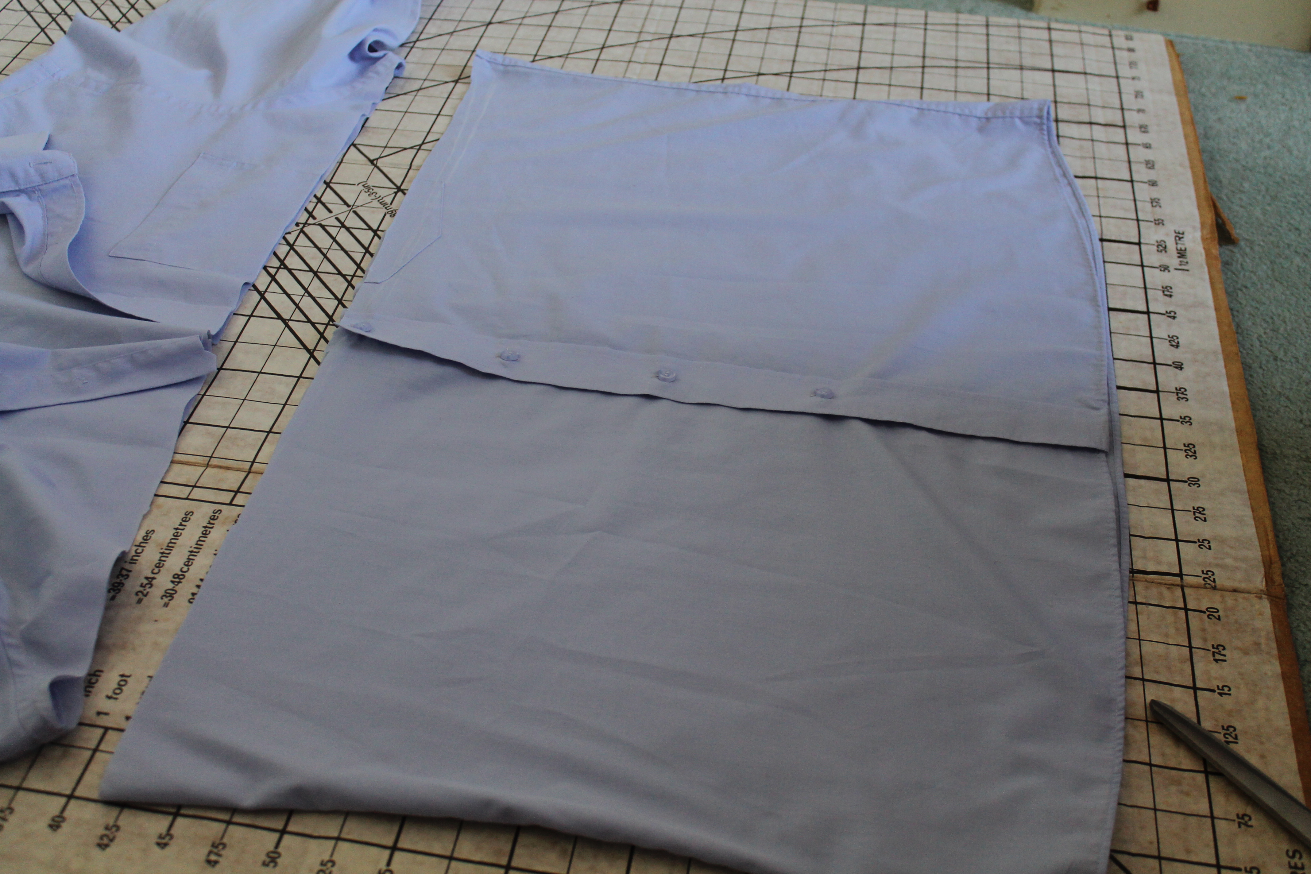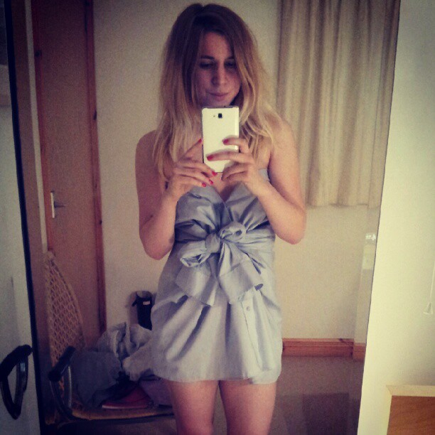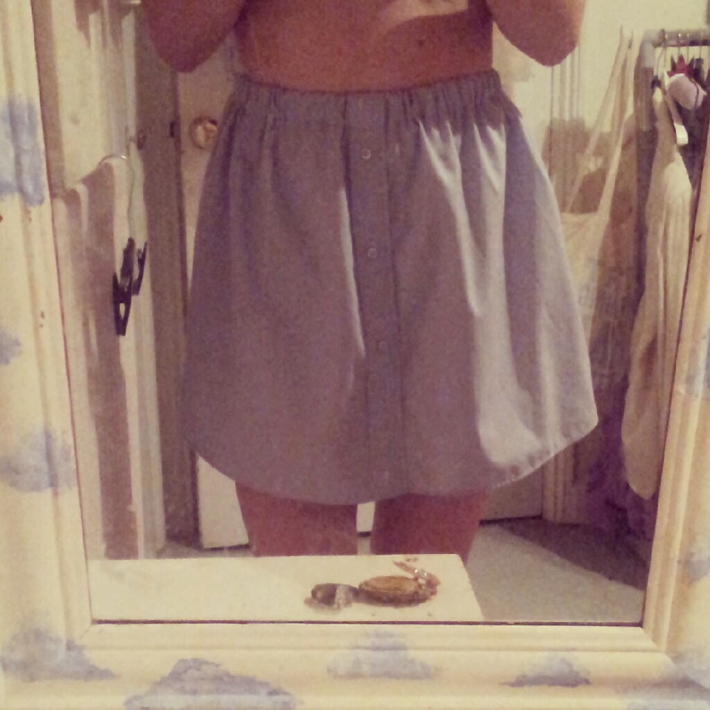 My two projects, then. I picked up a lovely cornflower blue man’s shirt from a charity shop for £3.30, and some non-roll elastic (AMAZING STUFF), and was inspired by Geneva Vanderzeil’s book to create a mini skirt from it. Seriously easy stuff, and perfect for first time sewers. I don’t want to write up the full instructions here, as I don’t think it’s fair to Geneva and her hard work, but I’d encourage you to grab her gorgeous book..Initially I tried the shirt as a dress, as you can see below – something I might explore another time, but it was VERY short. Sorry about the rubbish quality of pics in the post, was without my usual camera.