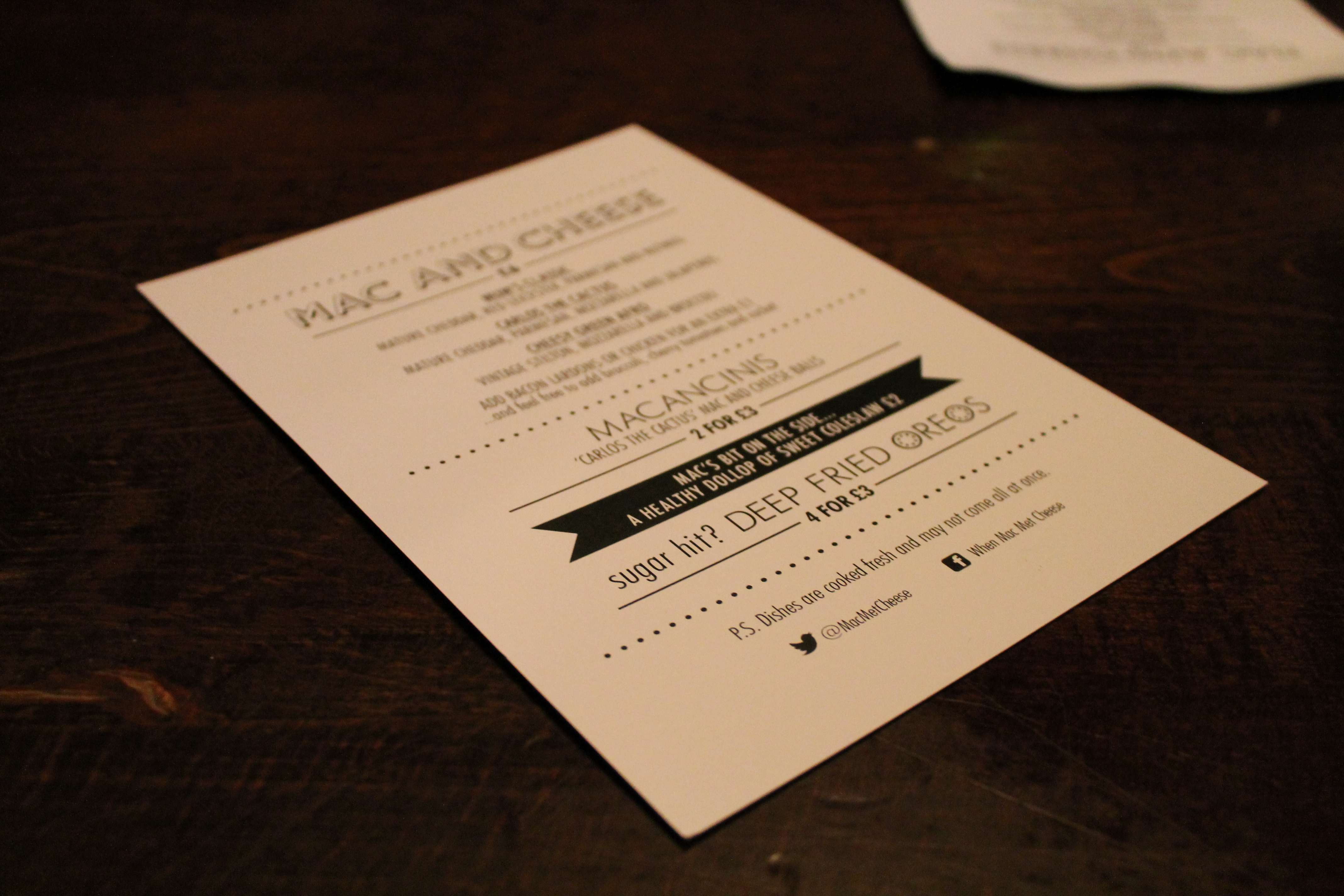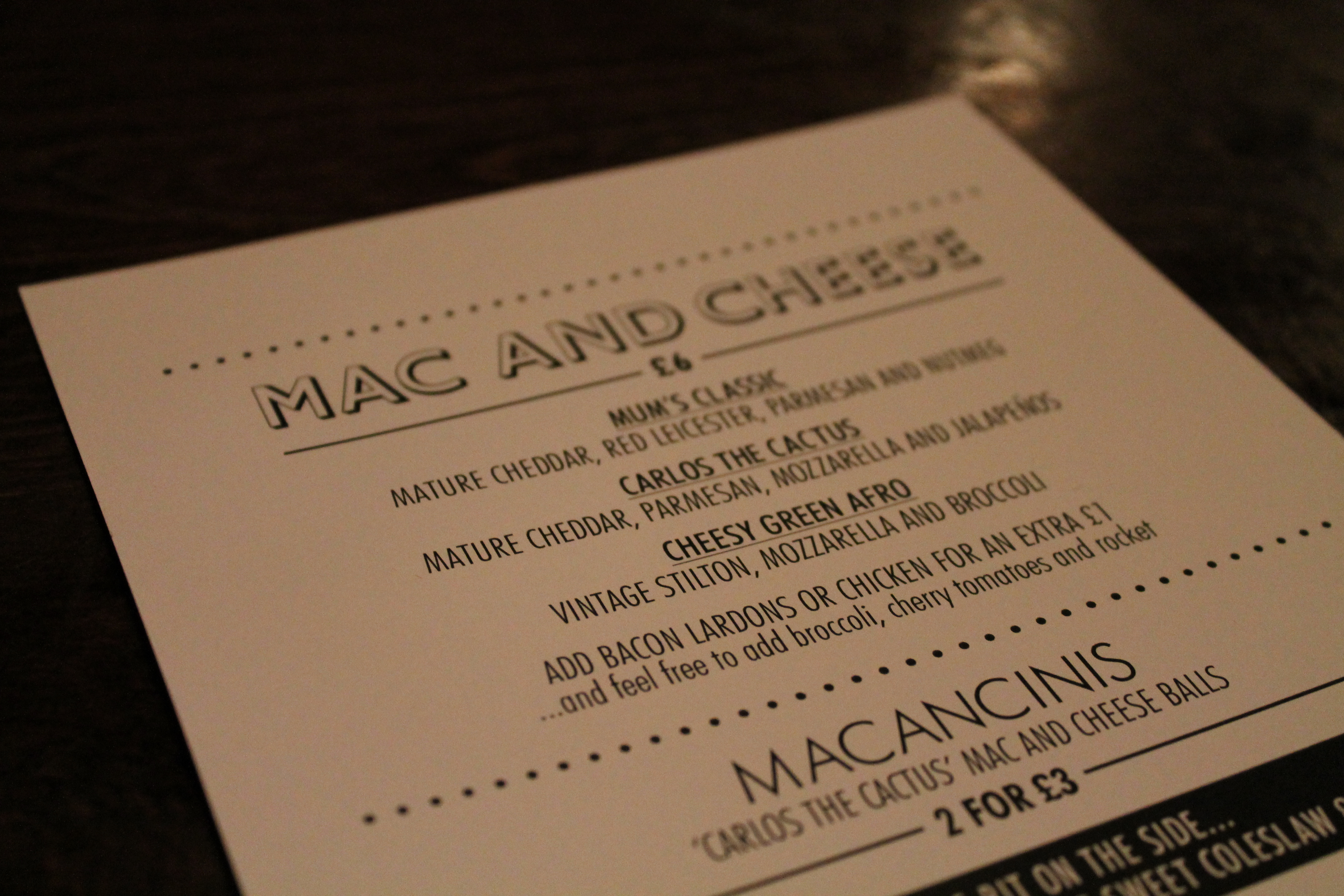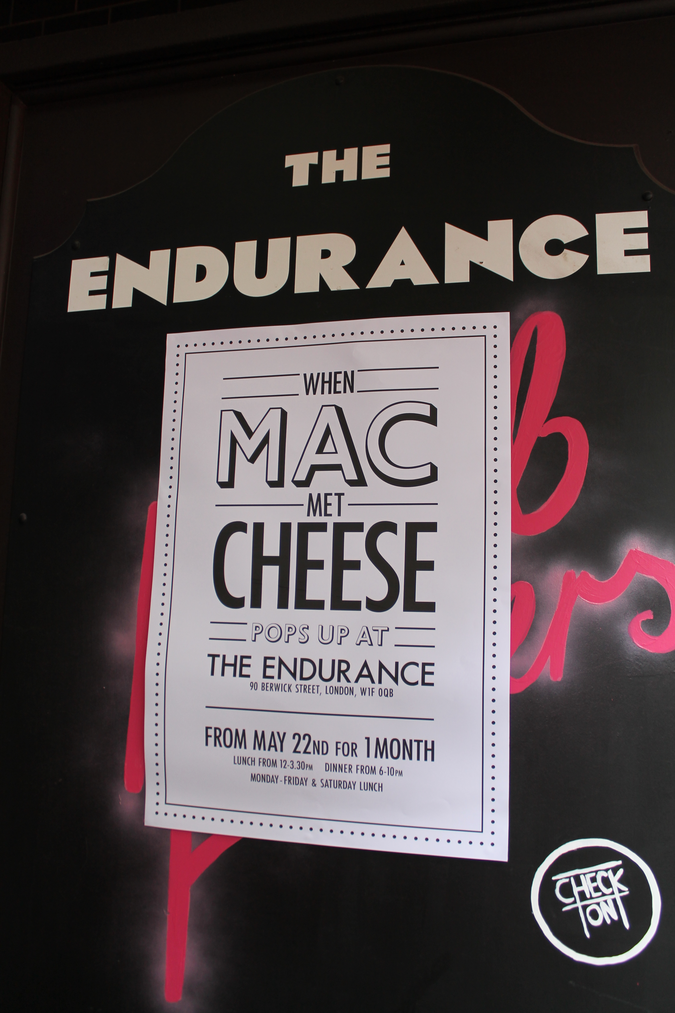 Virtually underneath our office is a rather glum pub aptly named The Endurance. It’s nearly empty and appears to play host to a variety of pop-up ventures, including When Mac Met Cheese. When I saw the posters, I nearly passed out with excitement. Mac and cheese is one of the most truly perfect foods in existence, and a dining experience solely devoted to it sounded wonderful. I’m a big fan of the new wave of restaurants offering just one choice of food in a couple of incarnations (Honest Burgers, Burger & Lobster, Bubbledogs). I read up on previous reviews of WMMC as a food stand, and set my hopes to: ludicrously high.